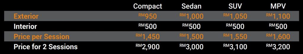 Basic detailing for the car’s exterior to remove common dirt and contaminants for a rejuvenated appearance with enhanced shine and protection. Best performed quarterly as it involves the use of specialised solutions only without any heavy machining or abrasive polishing works.